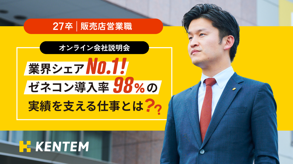 本イベントは、販売店営業職向けの選考直結型会社説明会です。 KENTEMのVISIONや事業内容のご紹介をはじめ、業務内容の理解・社員との交流をしていただけるプログラムとなっています!